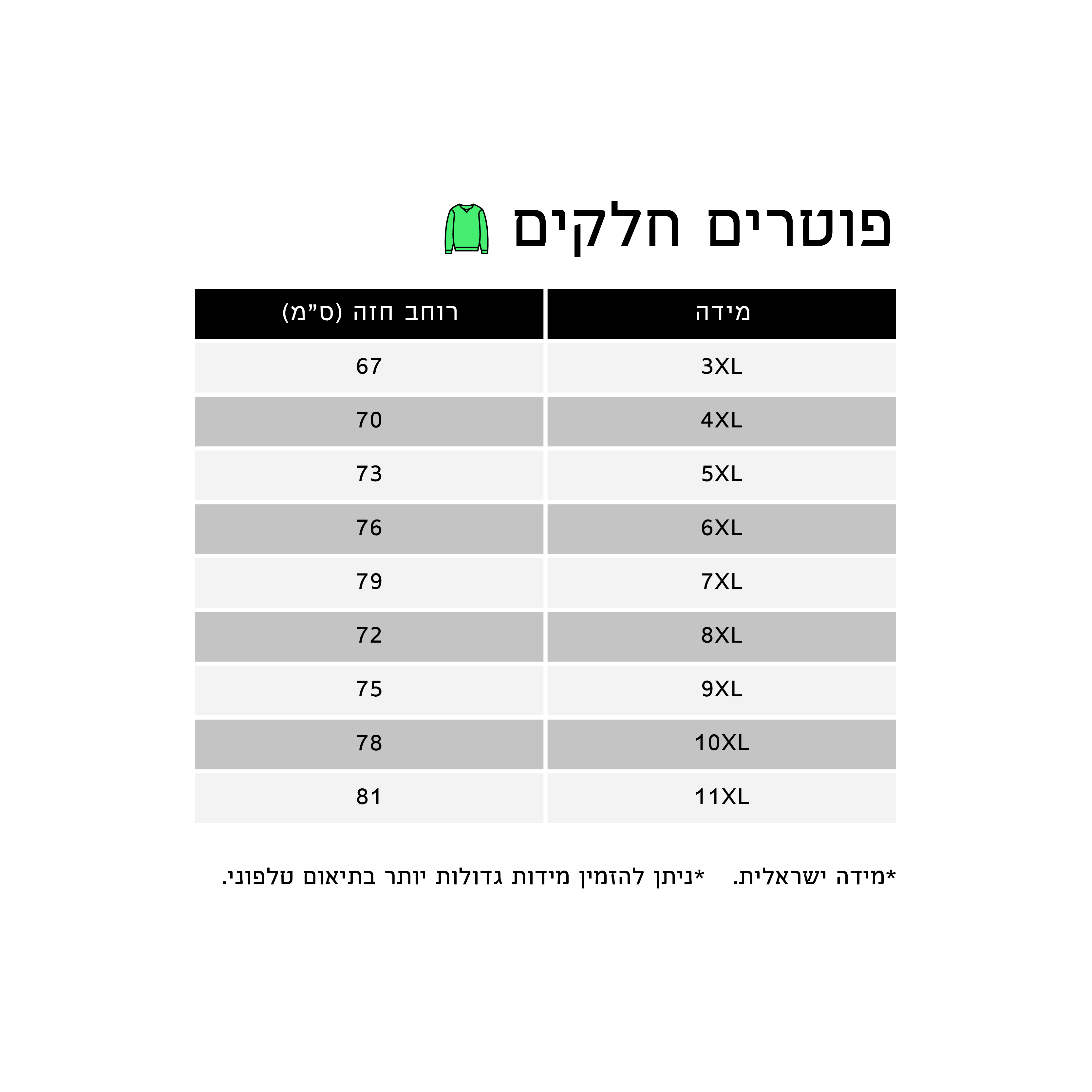 באיתך בגדול, תוכלו לשוחח עם נציג שירות בטלפון, על מנת למצוא יחדיו את המידה המתאימה ולסיים את ההזמנה בהצלחה!